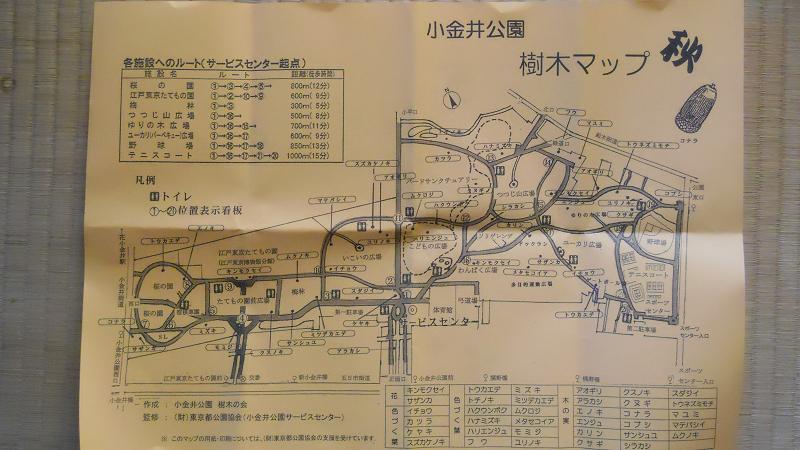 『小金井公園の樹木マップ』は園内にあるほぼ全ての樹木の位置が細かくマッピングされており、主要な入り口から木の場所までの所要時間なども書き込まれています。