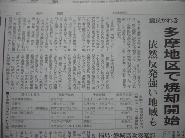 6/12朝日新聞の朝刊記事によると、羽村、日野、唐木田、稲城、町田、八王子、東久留米のごみ焼却場で放射性がれきの焼却を始めるそうです。